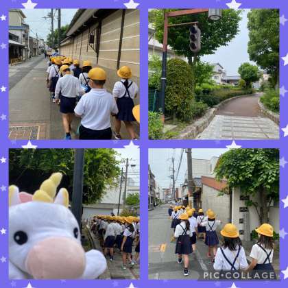 探検バッグを持ちながら、平野小学校の校区をまわりました。