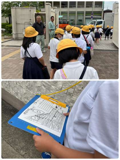 探検ボードに、習いたての地図記号を書き込もうと真剣な面持ちです。