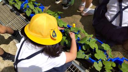 5月に植えたあさがおはぐんぐん成長し、双葉と本葉が出てきました。