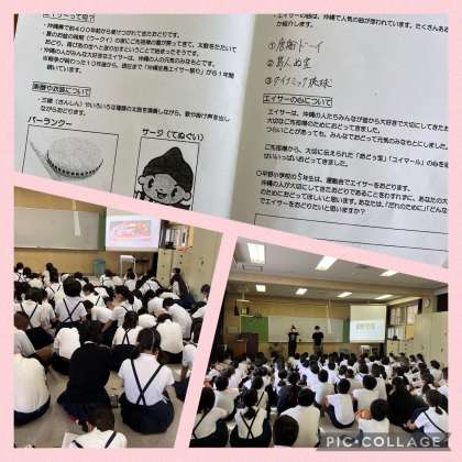 運動会に向けて学年集会がありました。その中で、みんなでおどるエイサーの歴史や楽器、衣装についてのお話を聞きました。今日から本格的に練習が始まります!