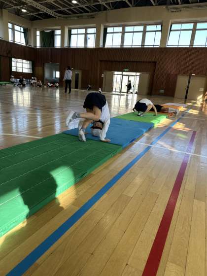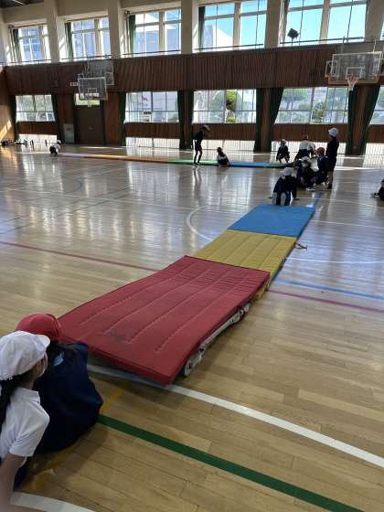 今日は、マットをつなげた長いコースで今まで学習した技にチャレンジしました。