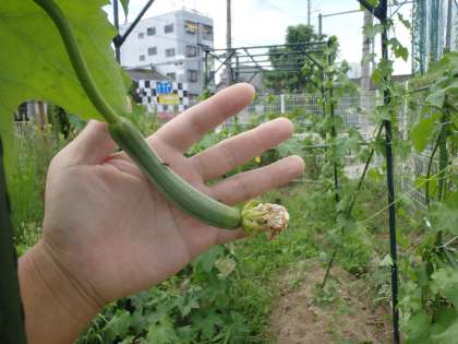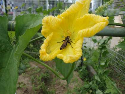 昆虫たちのおかげで学習園のヘチマにも小さな実ができていました。