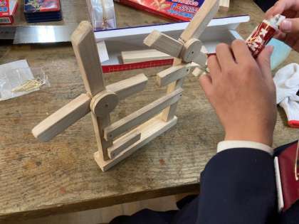 初めは、怖くてドキドキしていたノコギリでしたが、上手に使って切ることができました。切った後は、金づちで釘をトントン。