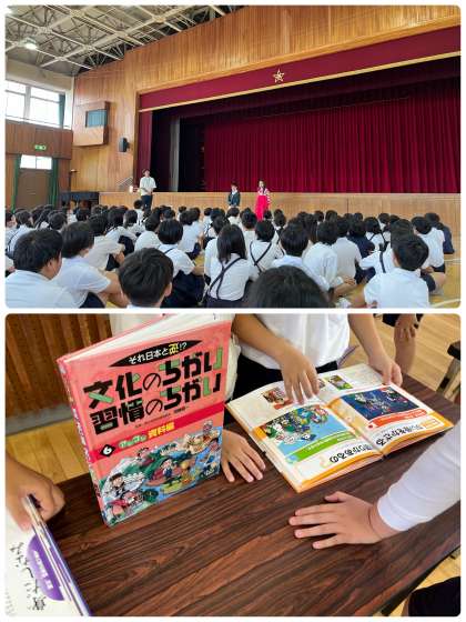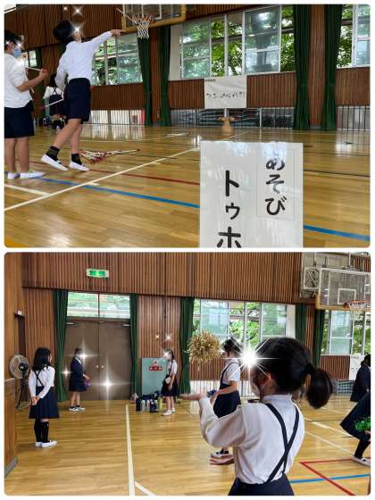 4年生のあそび交流会では、いろいろな国のあそびや楽器・本などに親しみました。