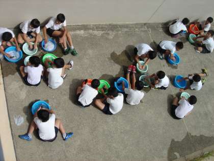 家庭科の学習でくつ下を洗たくしました。はじめは水だけで手洗いし、その後洗ざいを入れて手洗いし、よごれの落ち方を比べました。手でもみ洗いしたり、よごれのひどいところをつまみ洗いしたりして、活動に真剣に取り組むことができていました。毎日洗たくしてくれている家庭の方の大変さもわかったようです。