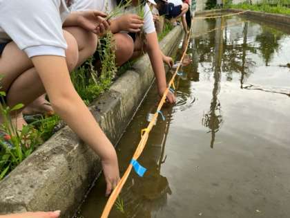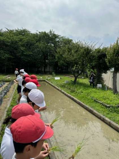 今日の1・2時間目に、5年生が田植え体験をしました。