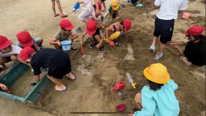 班に分かれて山や川を作ったり、泥団子アイスを作ったりとそれぞれで活動していました。