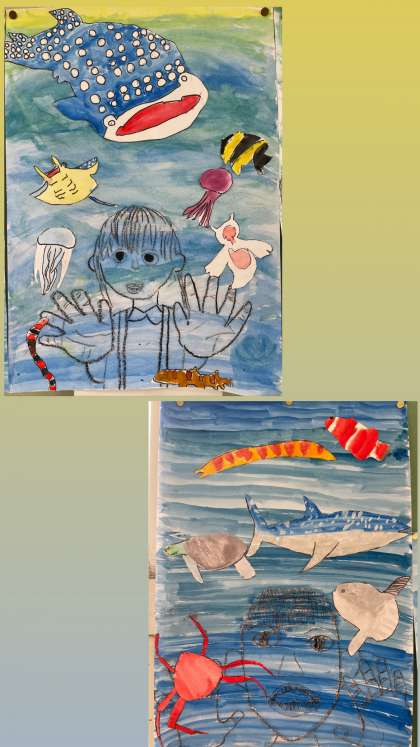 遠足で行った海遊館の水槽を思い出しながら、ジンベエザメやエイ、カニ、クラゲなどたくさんの海の生き物とともに水槽を覗いている自分も描きました。
