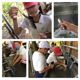 とった魚は、塩をつけてぬめりをとり、自分で串に刺します。