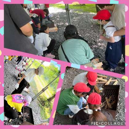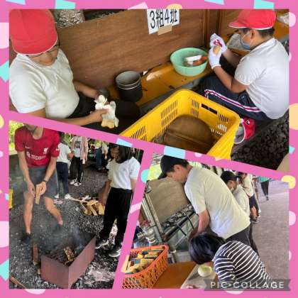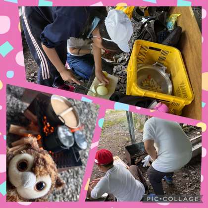 「私こっちするわな。」「小さめに切った方が良いよね。」「なかなか火がつかないっ」班で声をかけ合いながらカレーライスを作っています!