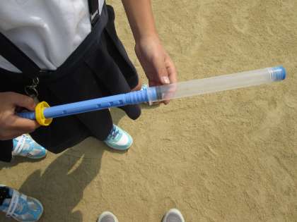 反対側に押し戻される感覚を感じました。その後、キャップをつけて空気をおしてキャップを飛ばす実験をしました。