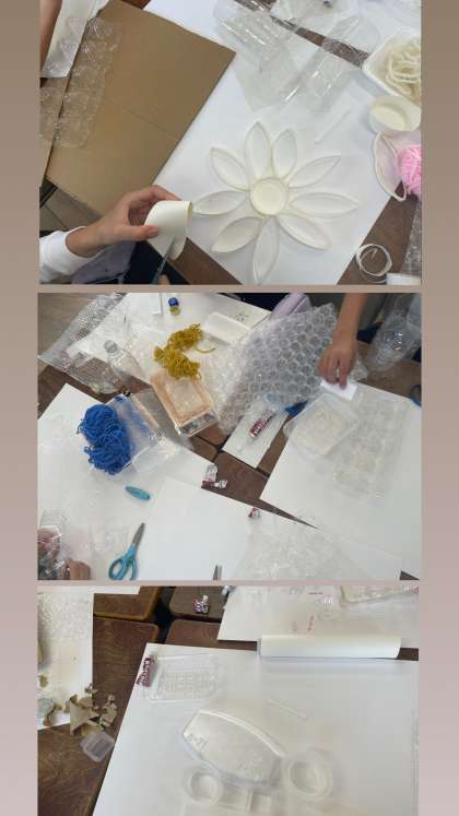 図画工作科の授業では、卵のパックやペットボトル、段ボールなど様々な材料を使って版画をしています。