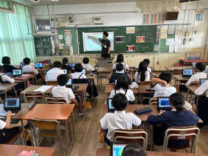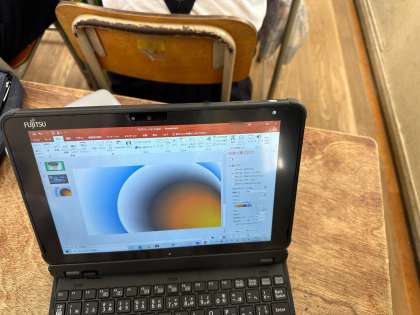 図画工作科では、タブレット端末を活用し、自分で考えた気持ちを単純な形や色などを使い表現する学習を行っています。