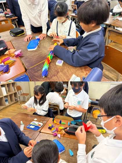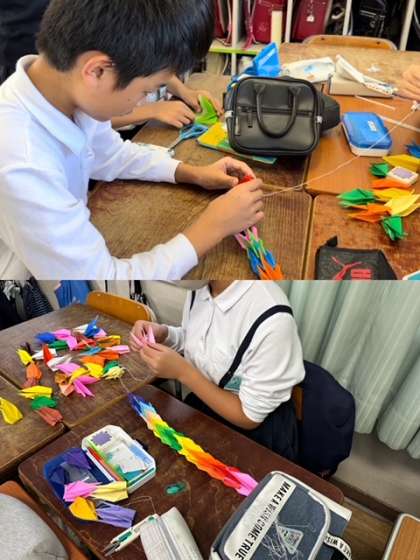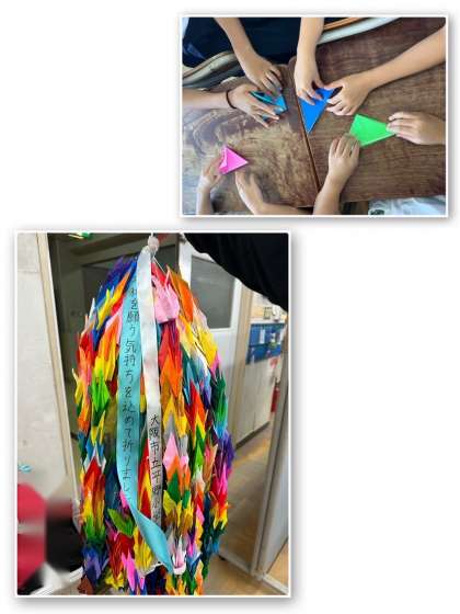 8月4日の平和人権登校日に全校児童で平和への思いを込めて作った折り鶴を、6年生が千羽鶴に仕上げました。