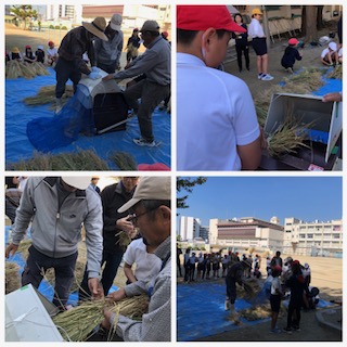 一人ずつ、学校の稲といただいた稲を脱穀していきます。