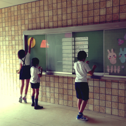 9月の掲示物を外し、10月の行事予定、飾りを掲示します。