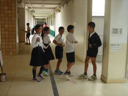 児童会のメンバーが、廊下・階段の正しい歩き方を呼びかけています。