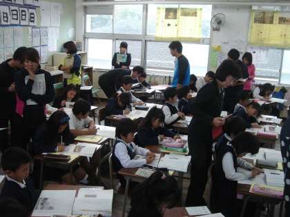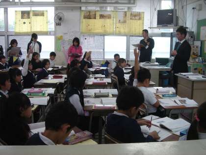 3年生の国語の授業を参観し、授業方法についての研修会を行いました。多くの教員が参観する中、3年生の子どもは緊張しながらも、大きな声で音読をしたり、ワークシートいっぱいに自分の思いをつづっていました。