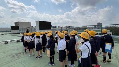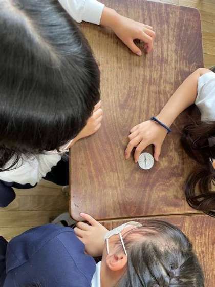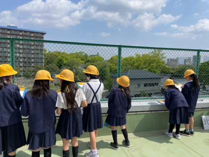 教室で方位磁針の使い方を学習し、『こっちが北やったら、反対は南、北を向いて西は左、その反対の東は右。』と方位を確かめました。そして、わくわくドキドキしながら移動し、初めての校舎屋上へ!活動がスタートすると、子ども達はルールをきちんと守り、そこから見えるものをいっぱいメモして、とても楽しそうに過ごしていました。