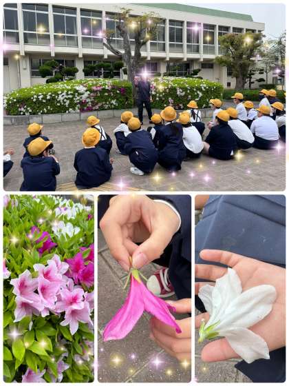 ツツジの観察では、5枚の花びらが元の方でまとまって1つの花となっている「合弁花」であると学び、子どもたちは「へぇ〜」と感心していました。