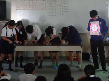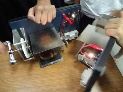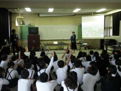 子どもたちは班ごとに発電機をまわして、電気のしくみを知りました。また、一日の中で一番電気を使っているのは「夜」だと思っている児童が多かったのですが、実は「昼」の2時ぐらいが一番電気を使っていることを知り、「ほんとにー!」「絶対夜だと思った!!」と驚いていました。その他に、もし海面が1m上昇すると大阪の砂浜が約90%なくなるという話などを聞いたりして、電気のことだけでなく環境についても知り学ぶことができました。