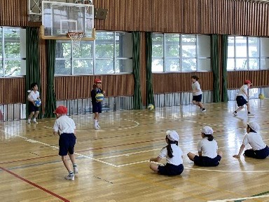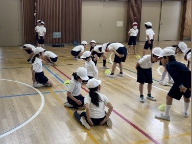 体育科の体づくり運動では、音楽に合わせてリズムジャンプをしたり、友だちとボールの受け渡しをしたりしました。