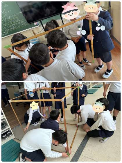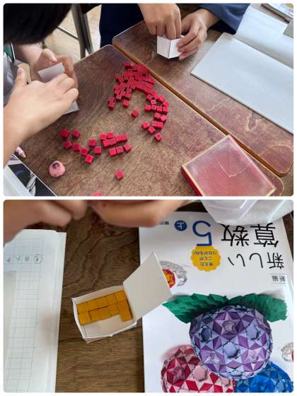 5年生、算数科の学習では、直方体や立方体の体積について学習を進めています。実際に1㎤や1㎥を手に取ったり作ったりして、量感をつかみました。1メートルものさしで1㎥を作る活動では、できあがった1㎥がとても不安定で完成したそばから倒れてゆくので、何度も作り直したり力を合わせて慎重に動かしたりしていました。