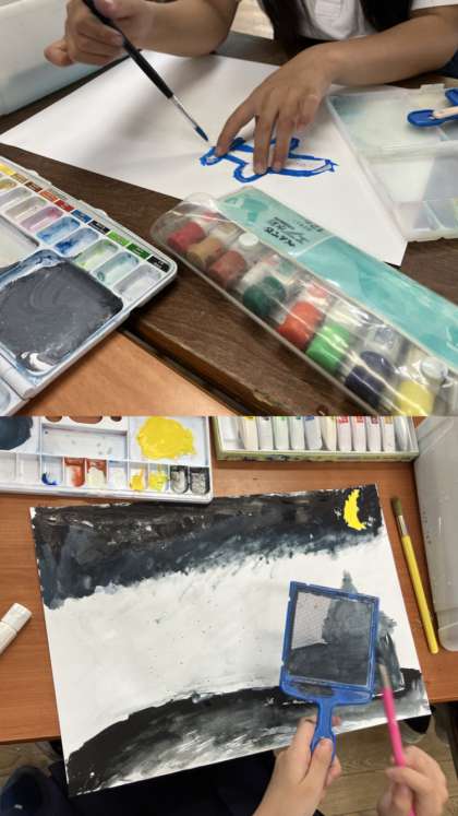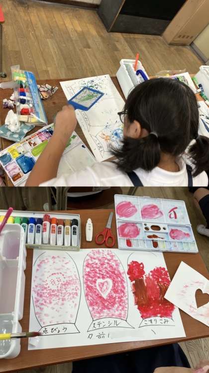 「点びょう」や「スパッタリング」など色々な技法を知り、工夫して作品を作りました。取り組んでいる時には「ここはスパッタリングでこだわってん!」や「みんなの作品すごいなぁ!」など楽しんで取り組む事が出来ていました。
