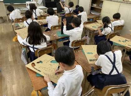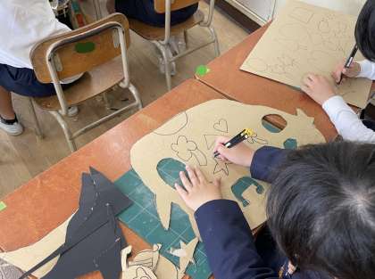 初めてカッターナイフを使う児童も多くいましたが、先生の話をしっかりと聞いて、活動に取り組むことができました。子どもたちは、「丸い形も上手く切り抜くことができた。」「ちょっと怖かったけれど、上手く切れてよかった。」「セロハンを貼ったらとてもきれい。」と達成感が得られた様子でした。
