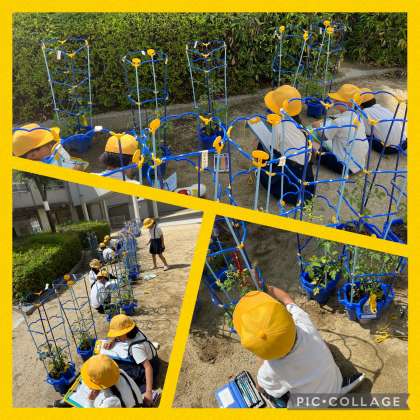 「あ!実ができてる!」「ちいちゃいのが4つもあるよ」「葉っぱからトマトのにおいがするー!」「くきからヒゲがはえてるよ!」