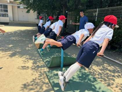 1年生は体育の授業で鉄棒を使った運動遊びに取り組んでいます。