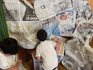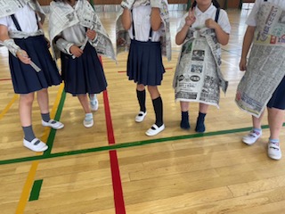 「新聞紙のお布団気持ち良い。」「めっちゃ広く繋げたよ。」「とてもかわいい服ができた。」など自分たちがつくった形や変化した新聞紙の面白さを味わう様子が見られました。