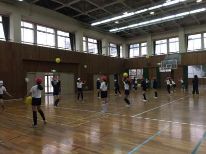「バレーボール」のオーバーハンドパスやアンダーハンドパスを教わり,初めての競技に戸惑いながらも,みんなで和気あいあいと授業に取り組むことができました。