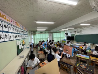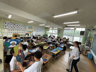 「顔を出したらなんだかワクワク」の学習の最後に顔出しパネル展をみんなでしました。それぞれの教室をクラス毎でまわり、思い思いに手にとり、顔を出して写真をとって楽しみました。