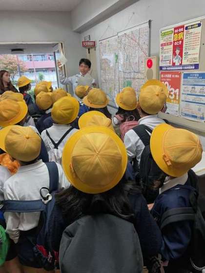 社会見学で平野消防署にいきました。多くの学習や体験をさせてもらいました。消防士さんの仕事内容を知り、署内の部屋の見学や訓練を見せてもらい消火器を実際に使わせてもらいました。みんなずっと大興奮でした。とても楽しい時間を過ごすことができました。