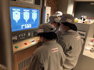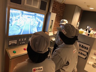 モニターで工場内の様子を見ながら、原料を混ぜます。