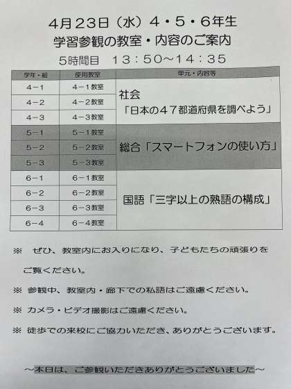 明日23日(水)の5時間目は、4.5.6年生の学習参観、6時間目は、PTA保護者会、懇談会です。お忙しい中ではありますが、ぜひご参加ください。