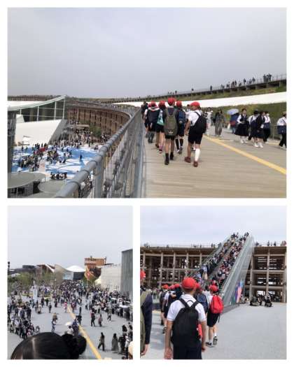 長い長いエスカレーターで上がると、たくさんのパビリオンが見えます。