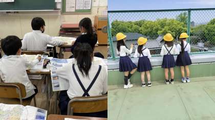 「あっちがハルカス!」「こっちが北ということはあっちは南!」と、学校の屋上からまちのようすを見ました。また、地図を開いてたくさんの場所を探しました。「ユニバある!」「小学校や!」とワクワクした様子で大阪市を調べることができました。