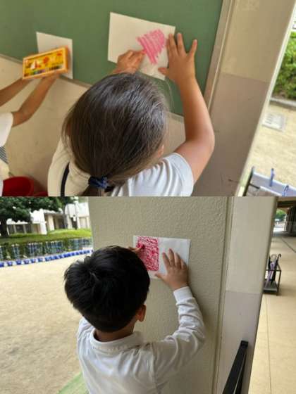 学校にあるでこぼこしたところを探して、紙の上からクレパスや色えんぴつなどを使って色を塗ります。