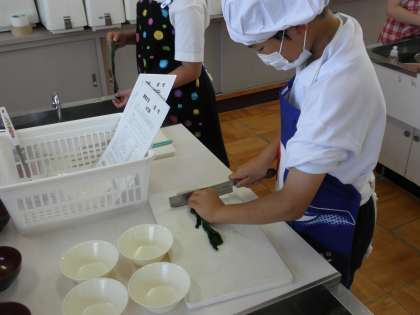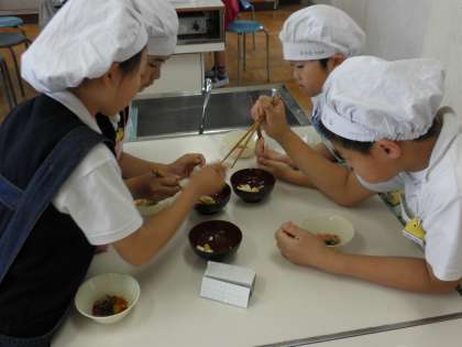 5年生は調理実習を行いました。メニューは「ゆで卵」と「ほうれんそうのおひたし」です。コンロに点火することや、包丁を扱うことに最初は不慣れな様子でしたが、時間がたつにつれて、堂々と扱うことができていました。調理後、試食する際は、やり終えたことに満足した様子で、どの料理もおいしくいただくことができました。