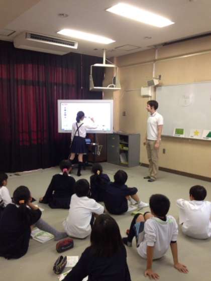 色や図形などの単語を繰り返し発音し、先生の言うデザインのTシャツを電子黒板を使ってバーチャルで作成しました。
