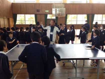 実際に盲導犬を連れてきていただいたので、盲導犬のブライディーと触れ合うこともできました。また、障がい者スポーツとして卓球も体験しました。