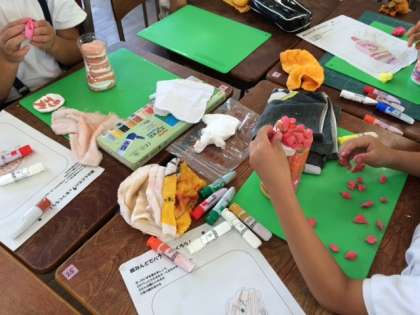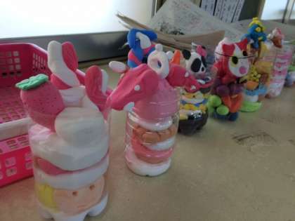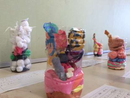 設計図作りから始まり、紙粘土に絵の具を混ぜ込んで色つきの粘土を作り、形を作って盛り付けていきました。一人ひとり工夫がされていて、プリンやクッキー、果物などとてもおいしそうなパフェがたくさん出来上がりました。