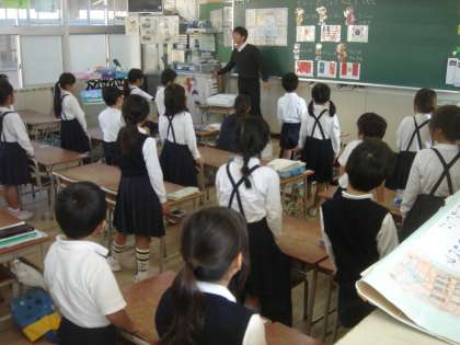 1時間目・国語「サラダでげんき」、2時間目・学級活動「世界のあいさつ」(国際理解教育)