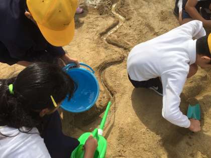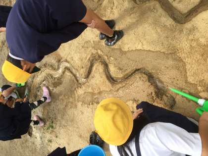 実際に運動場にある土山に溝をほって水を流し,流れる水が土を削っていく様子を観察しました。