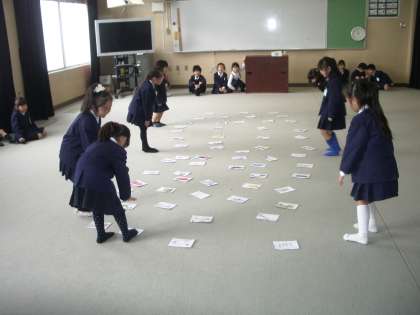 そのカルタを使って、まずは、教室でグループごとにカルタ大会をし、最後に大きな部屋ですべてのカルタを使って、大カルタ大会をしました。みんな白熱して、とても盛り上がりました。