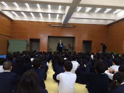 中庭で話を聞いて、いざ見学。廊下を歩きながらいろいろな教室や職員室の前を通りました。最後には格技室で校長先生のお話。そして最後には質問タイムがありました。