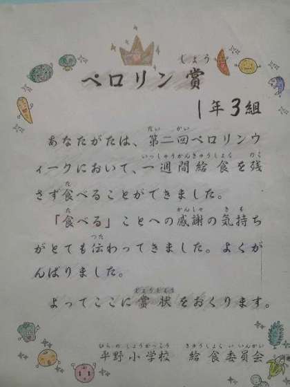 「ペロリン賞」とは、「ペロリンウィーク」の給食時、1週間のすべての日で残菜を出さなかったクラスに贈られます。