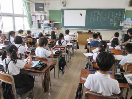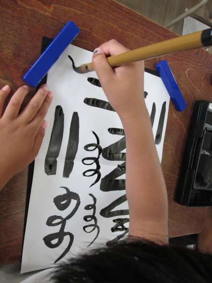 筆、下敷き、すずり、文鎮…たくさんの用具を準備するだけでも一苦労の子どもたち。